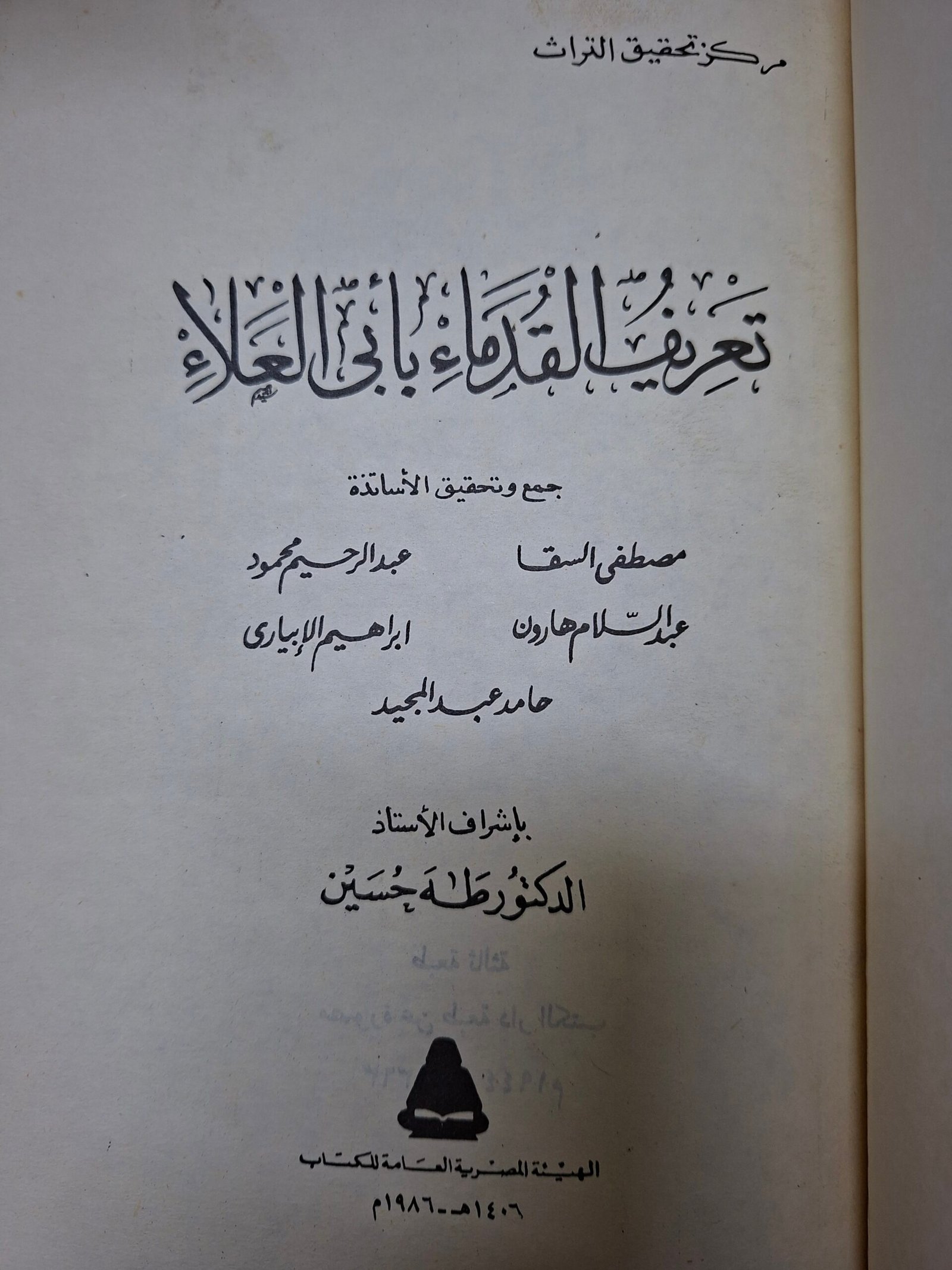 كمية تعريف القدماء بابي العلاء جمع وتحقيق#مصطفي السقا، عبدالسلام هارون#